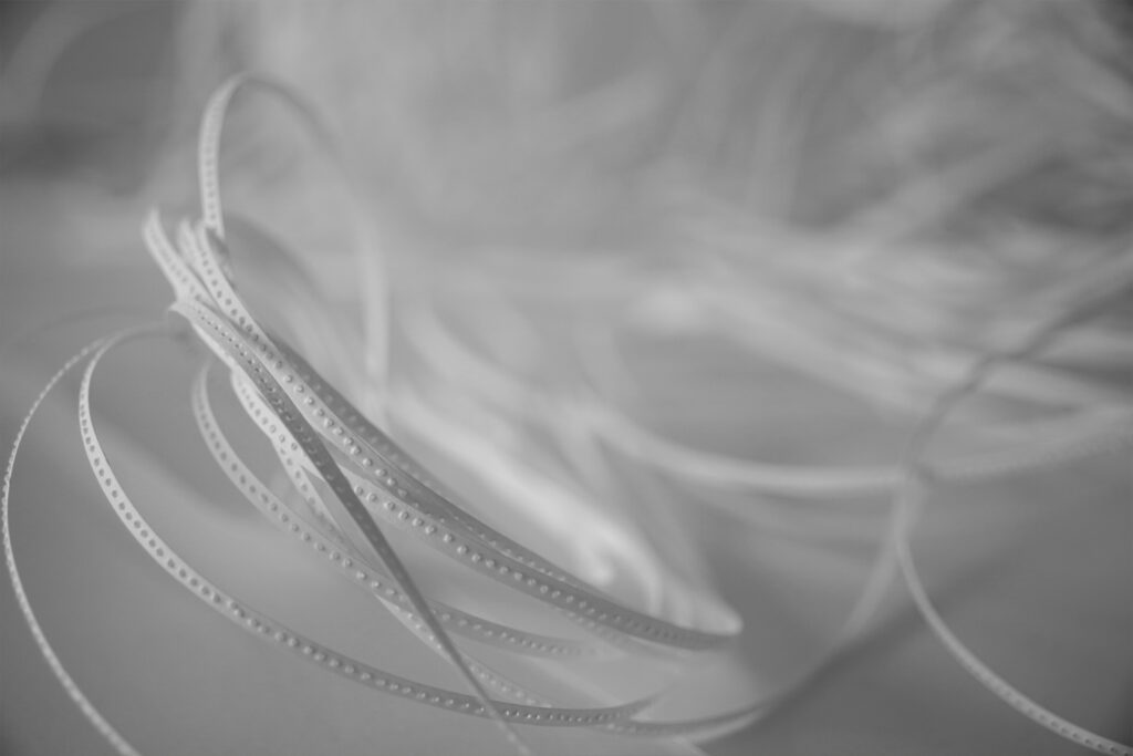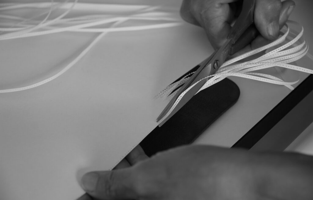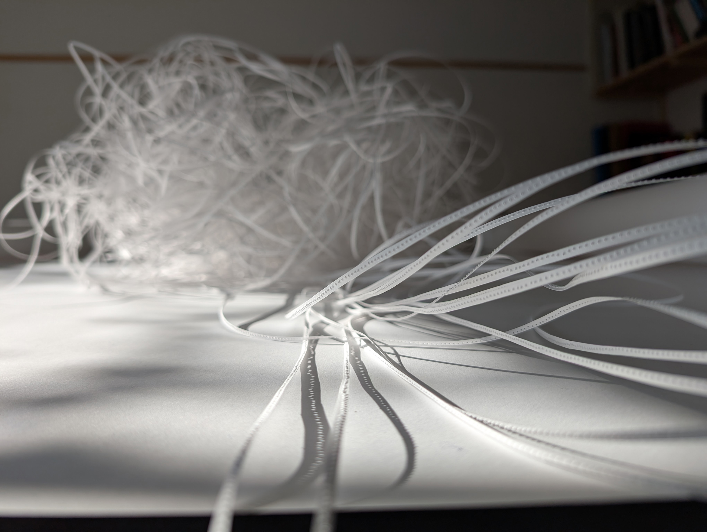 The strips of paper resemble discarded off-cuts, referencing data degradation, misinterpretation and instability.