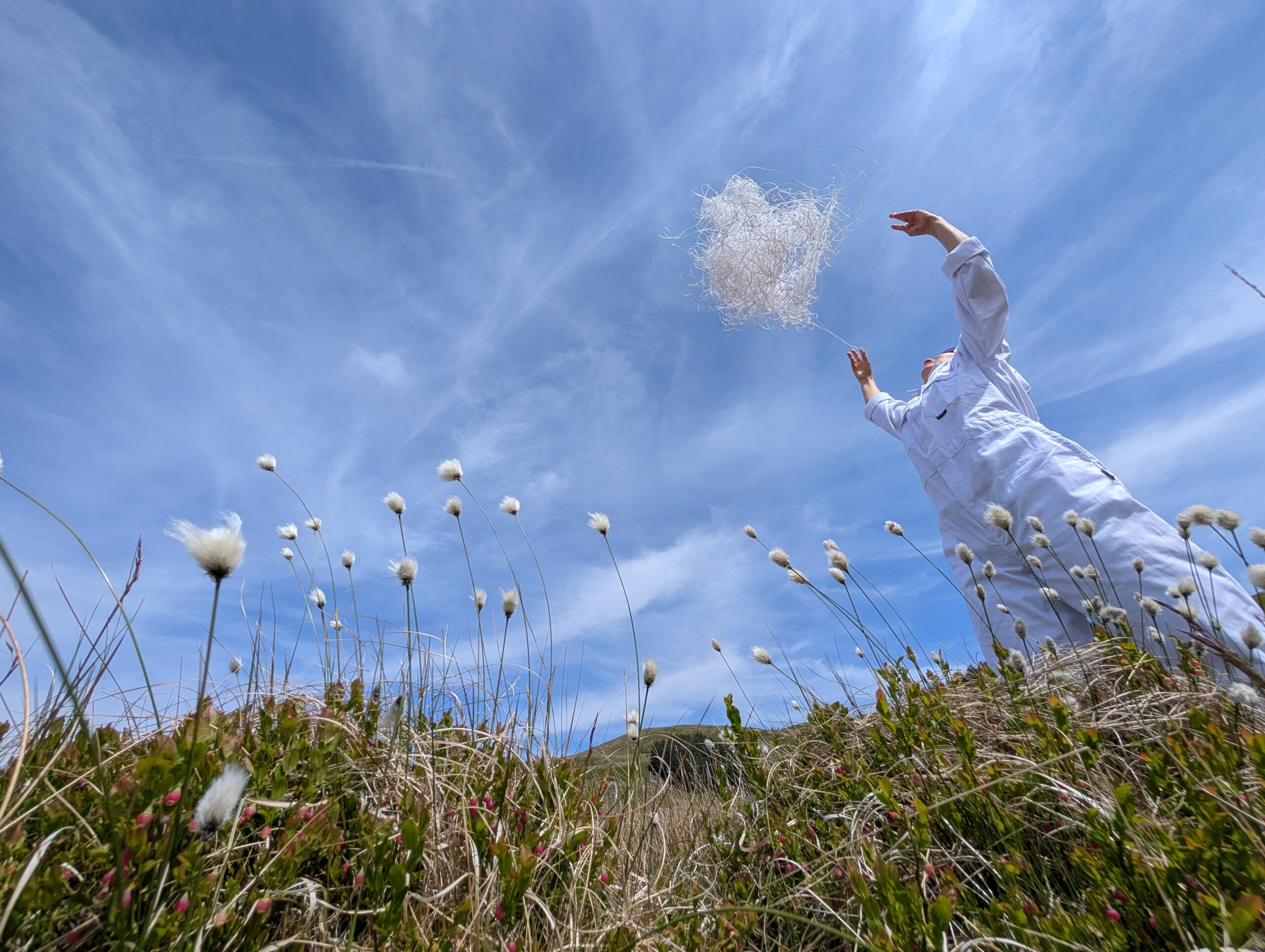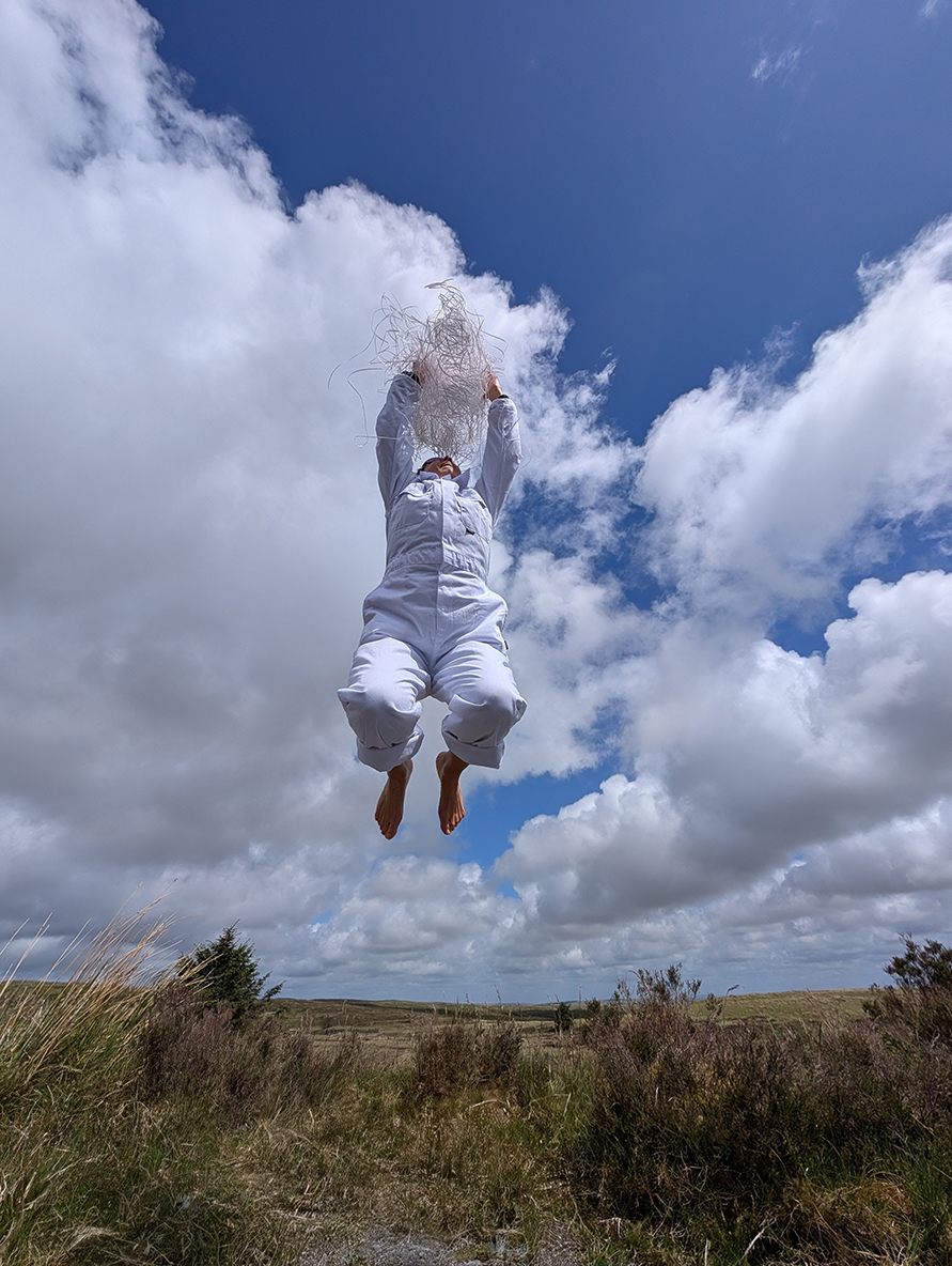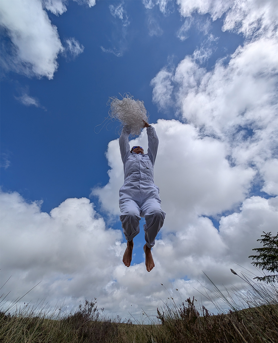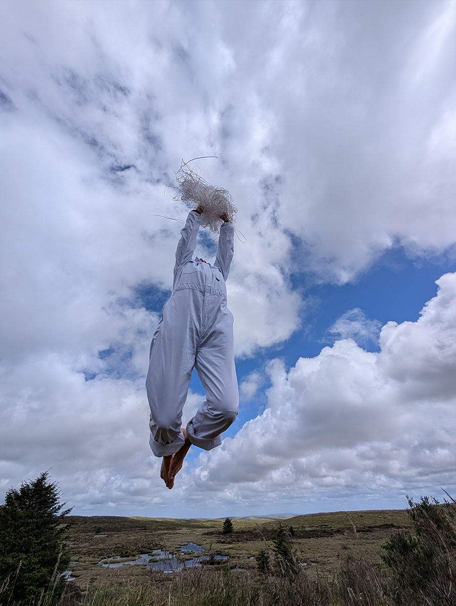 It was very windy, so I didn’t dare let go of the cloud. Its form collapsed, more squashed than cloud-like. But I love the shapes my body made – my limbs stretched, and bare toes appearing to skim the peaty pools below.