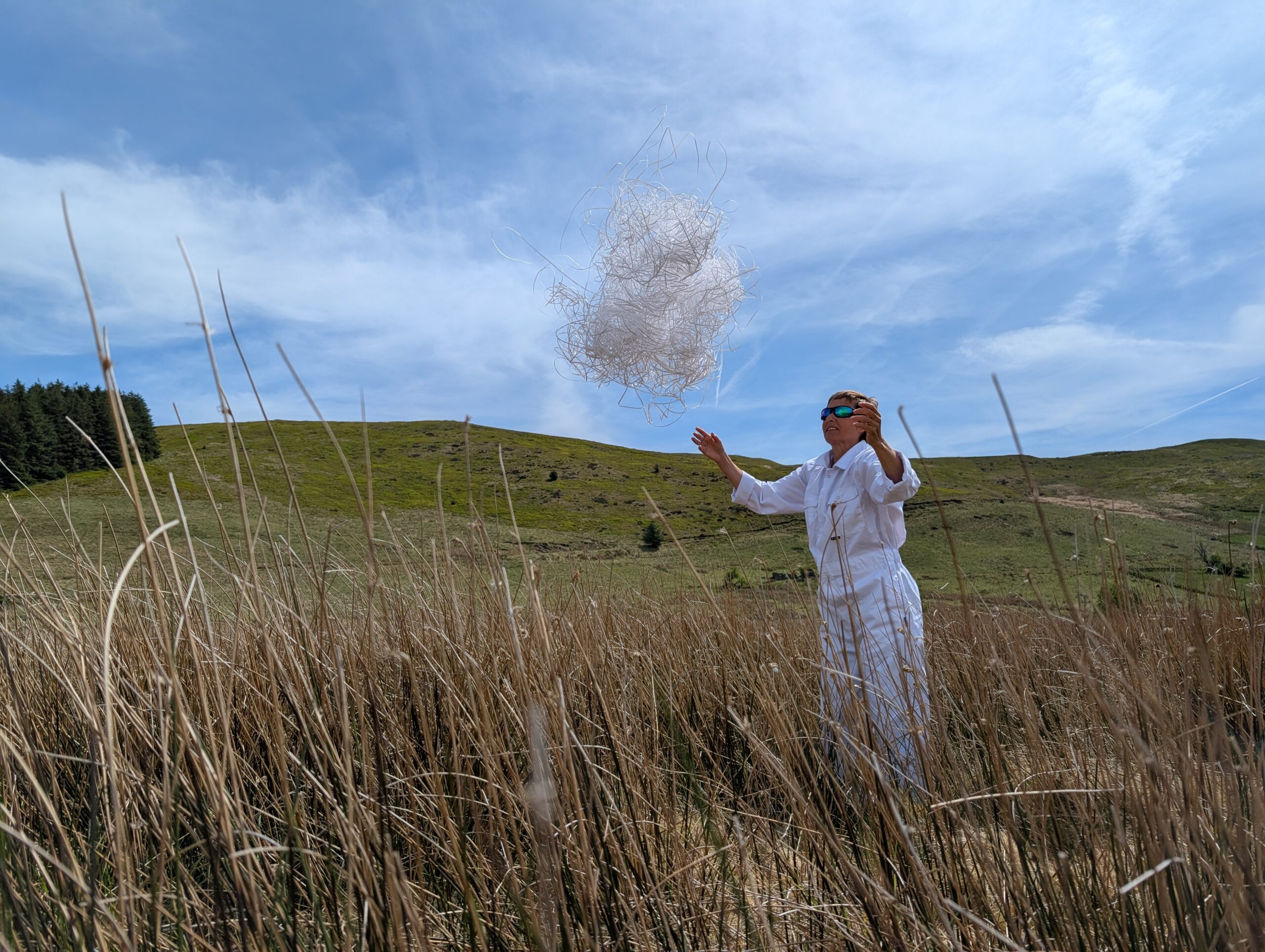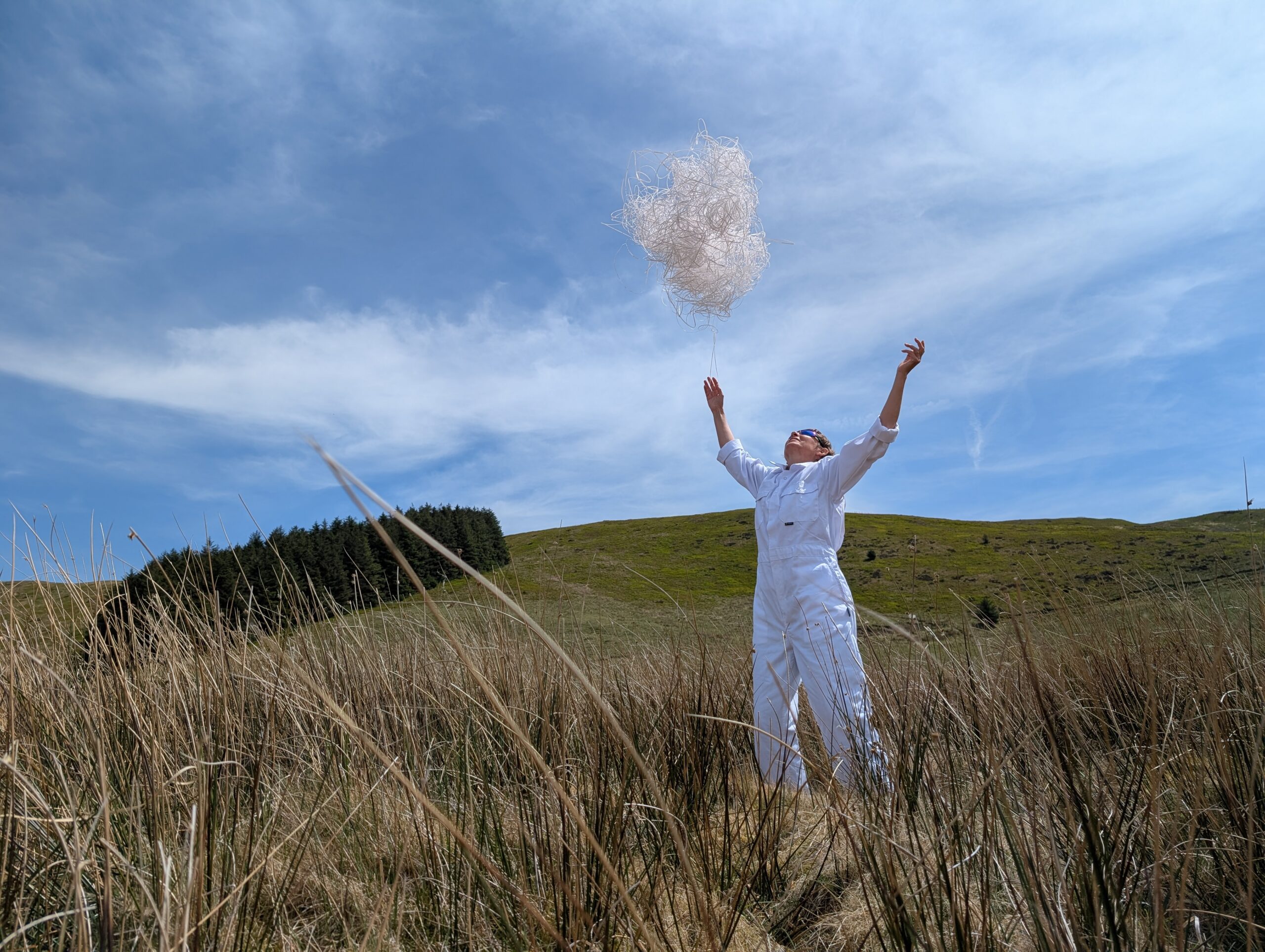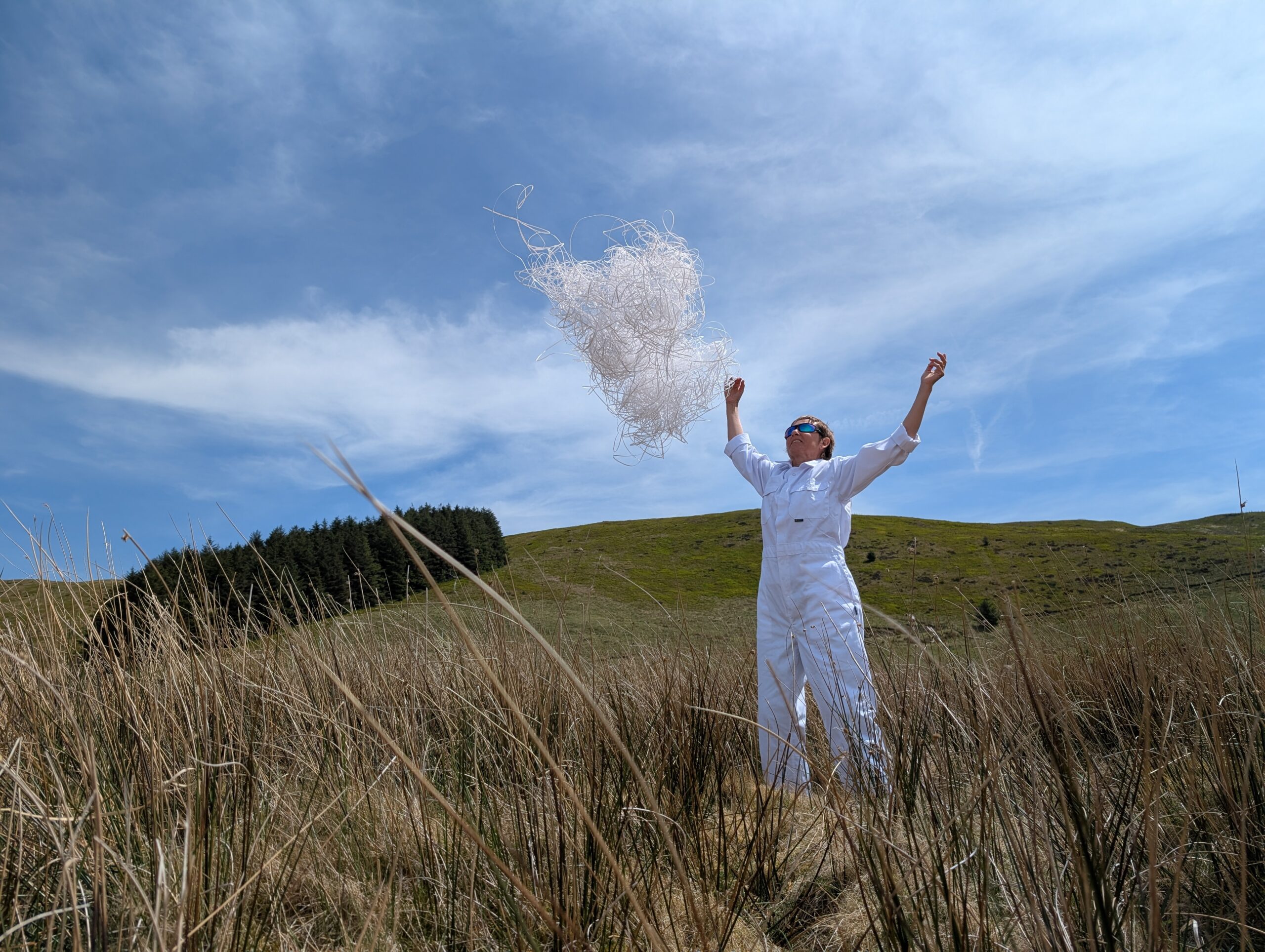 I took the Boggy Cloud (in progress) to throw in the air above the degraded peatland adjacent to the GGR- Peat research site at Pwllpeiran Upland Research Centre, Cambrian Mountains. A male Cuckoo’s call resounding over the peatland made the experience even more special. The cloud needs to be at least 4 times bigger, so 4 months of data to have the impact I want. This cloud as it is contains approx. 249,984 data points (pin pricks) so to get to 999,936 I have my work cut out..