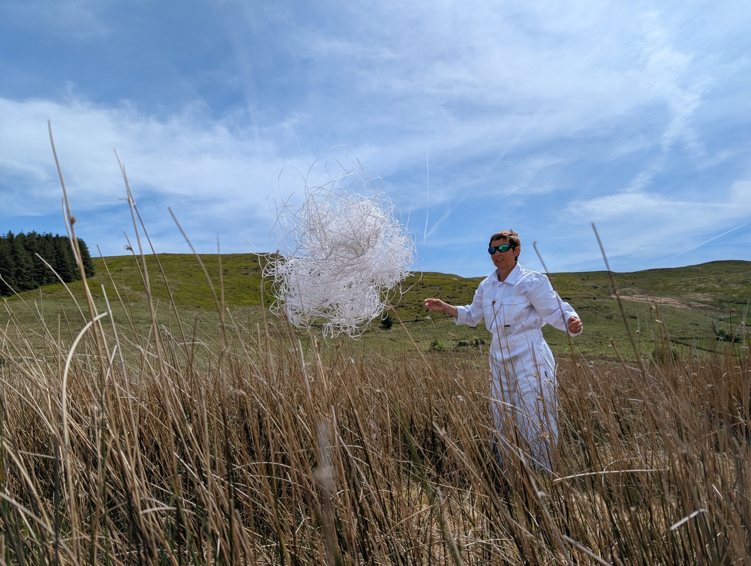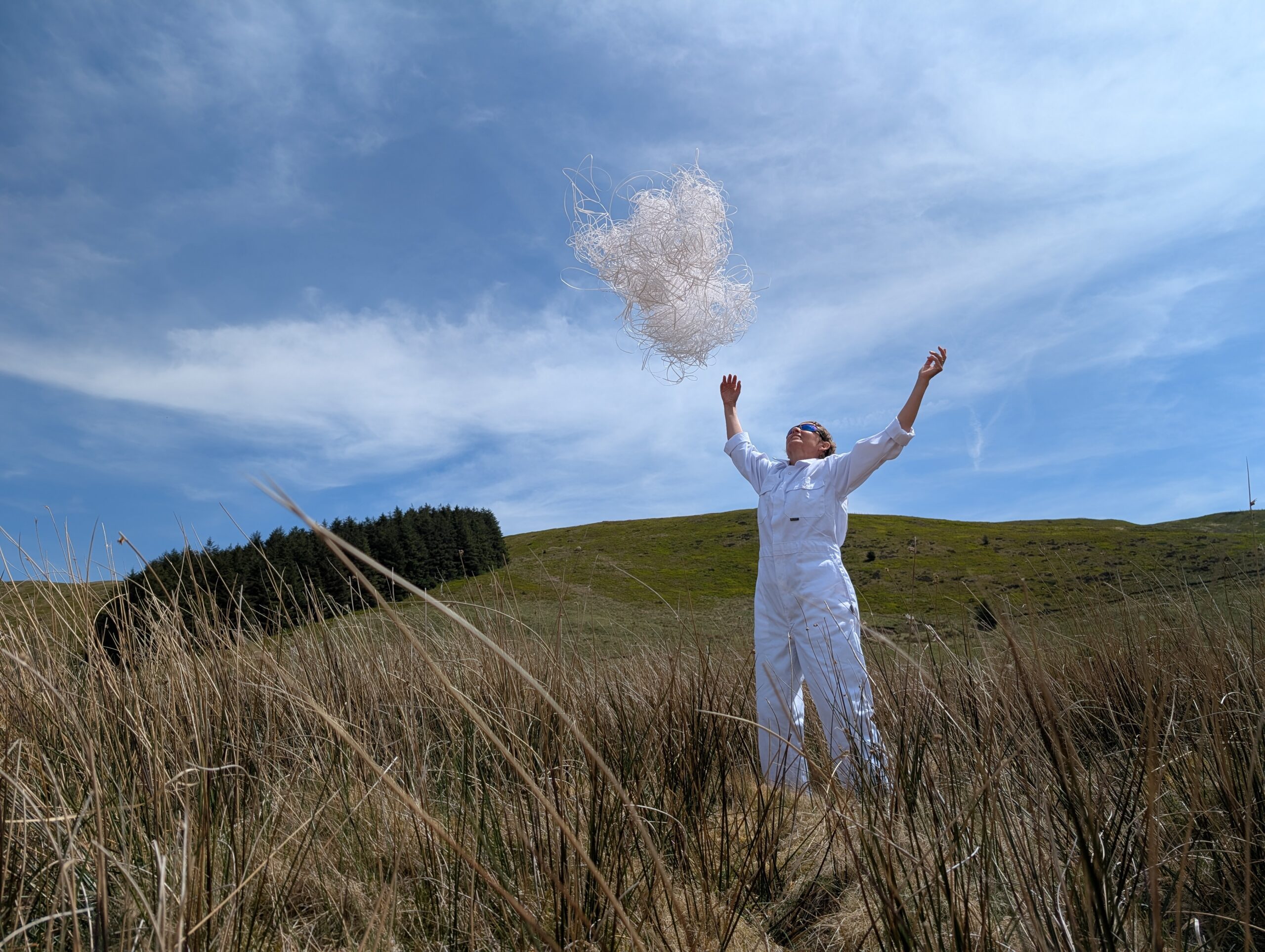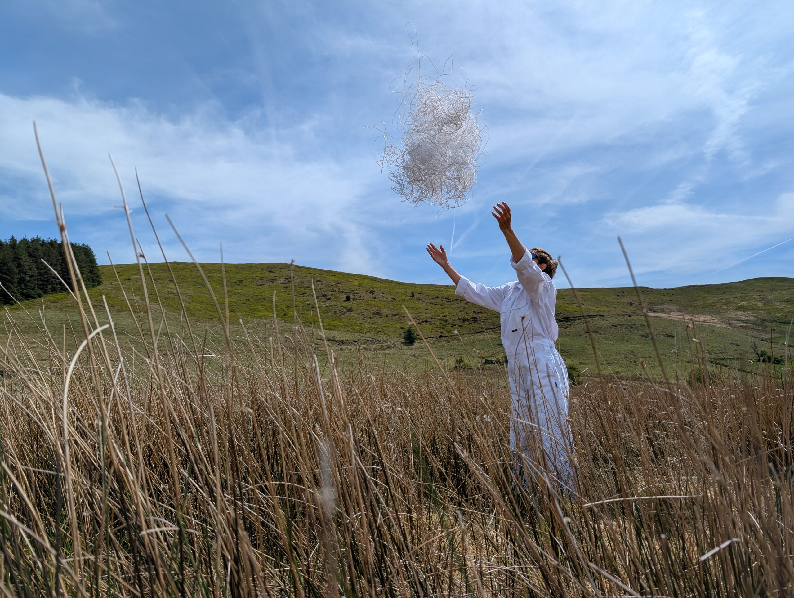 I took the Boggy Cloud (in progress) to throw in the air above the degraded peatland adjacent to the GGR- Peat research site at Pwllpeiran Upland Research Centre, Cambrian Mountains. A male Cuckoo’s call resounding over the peatland made the experience even more special. The cloud needs to be at least 4 times bigger, so 4 months of data to have the impact I want. This cloud as it is contains approx. 249,984 data points (pin pricks) so to get to 999,936 I have my work cut out..