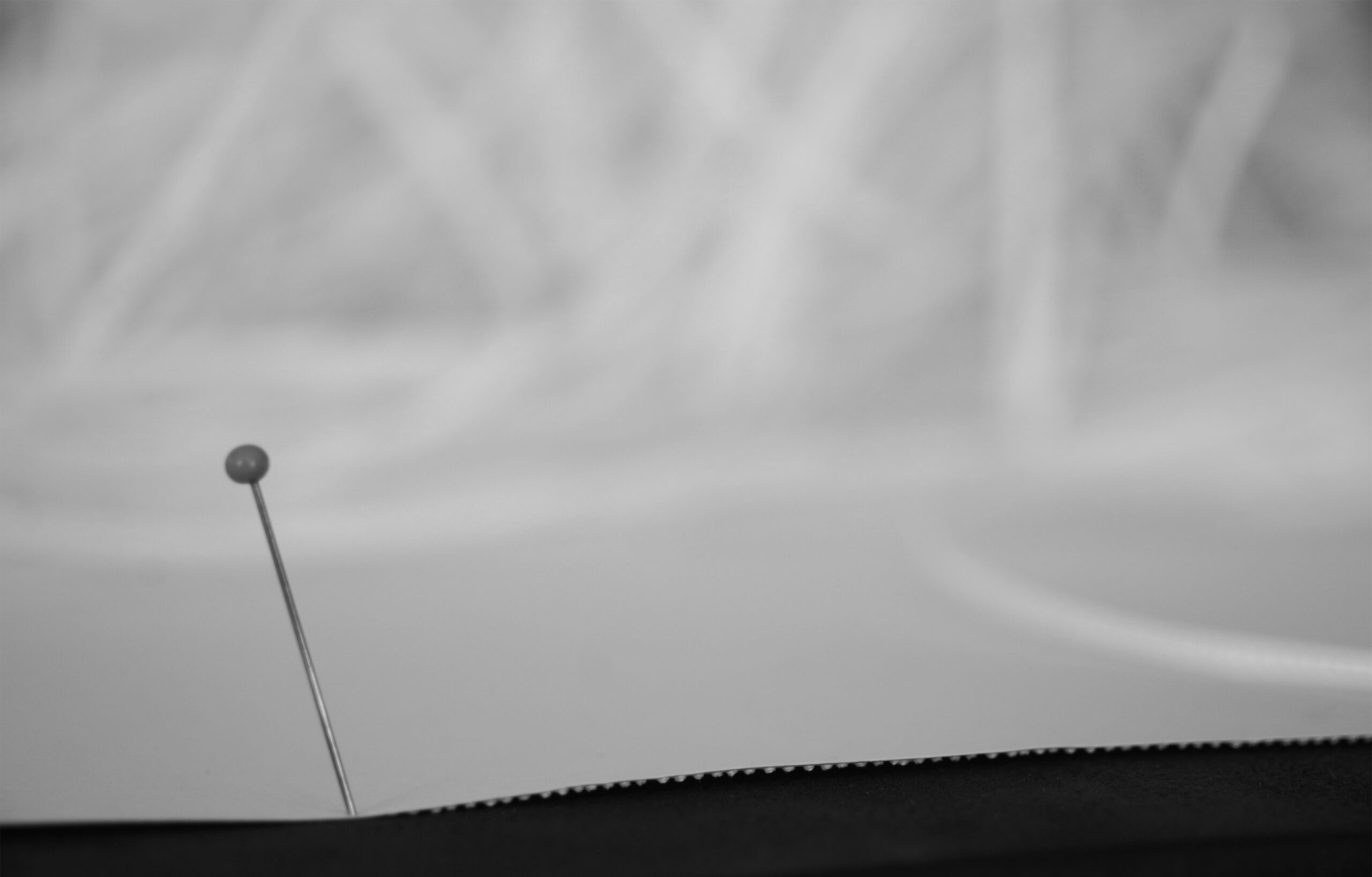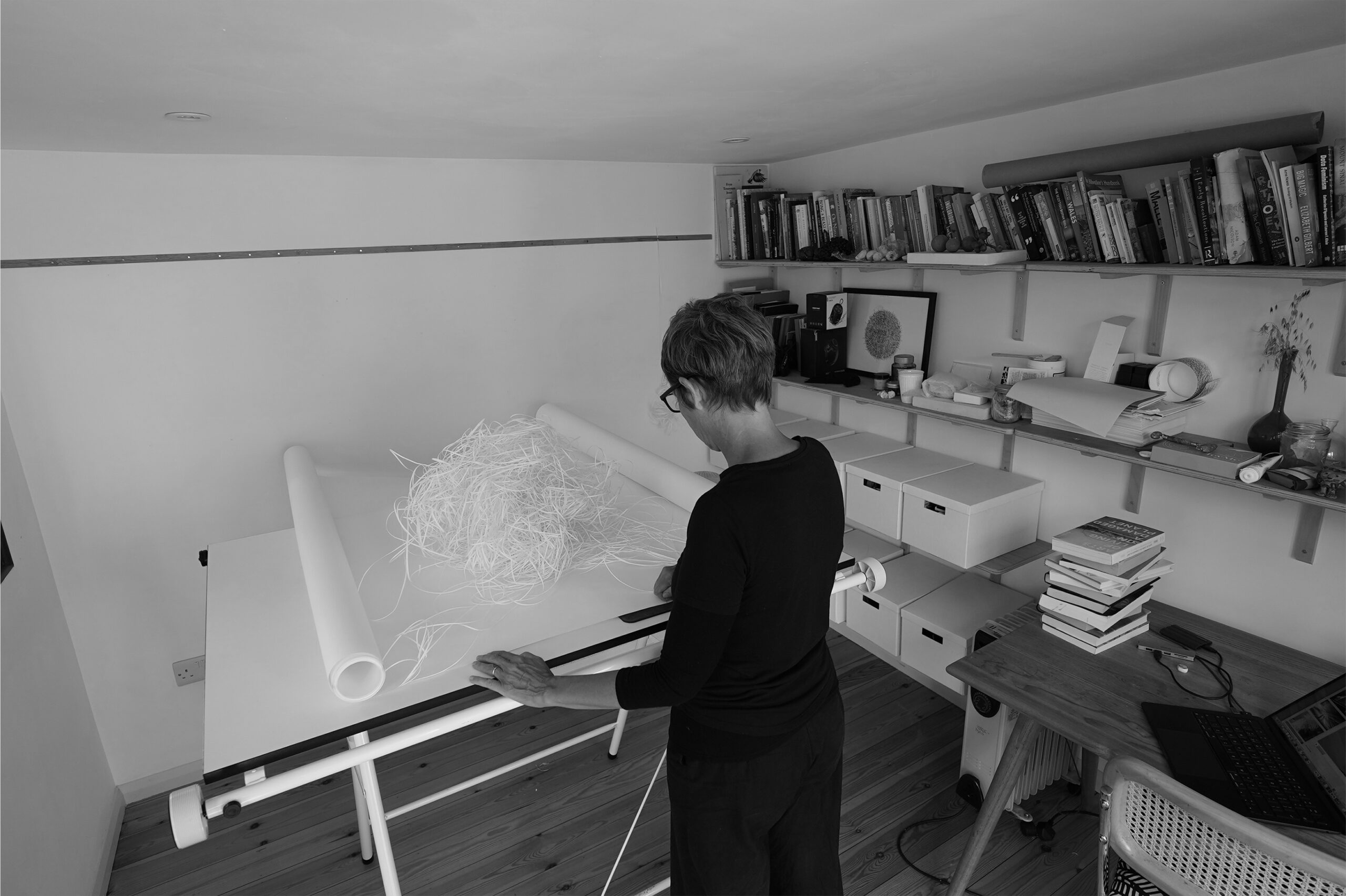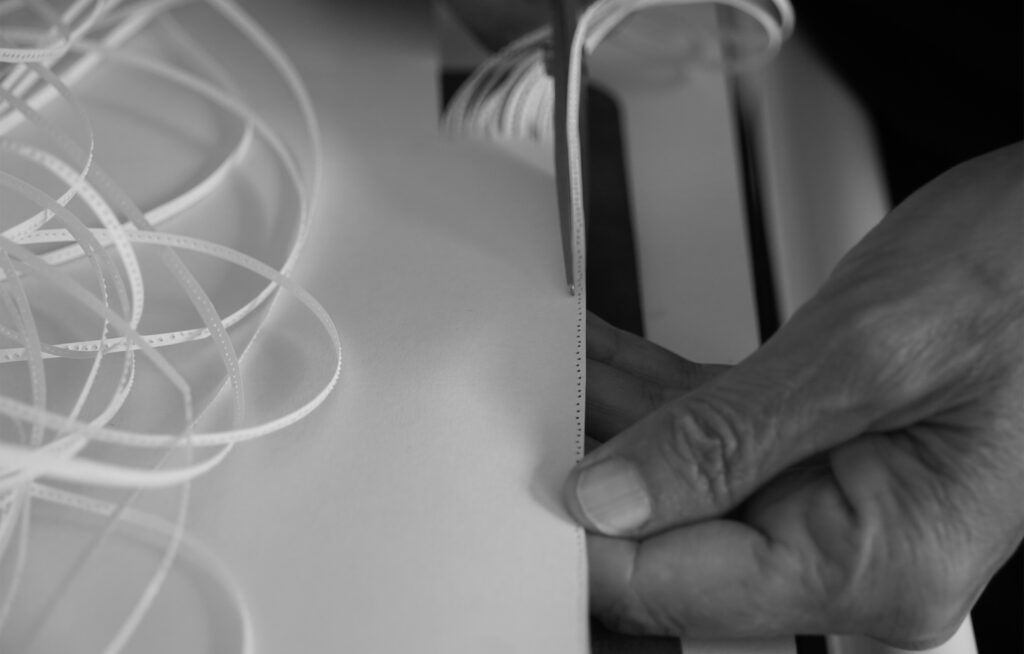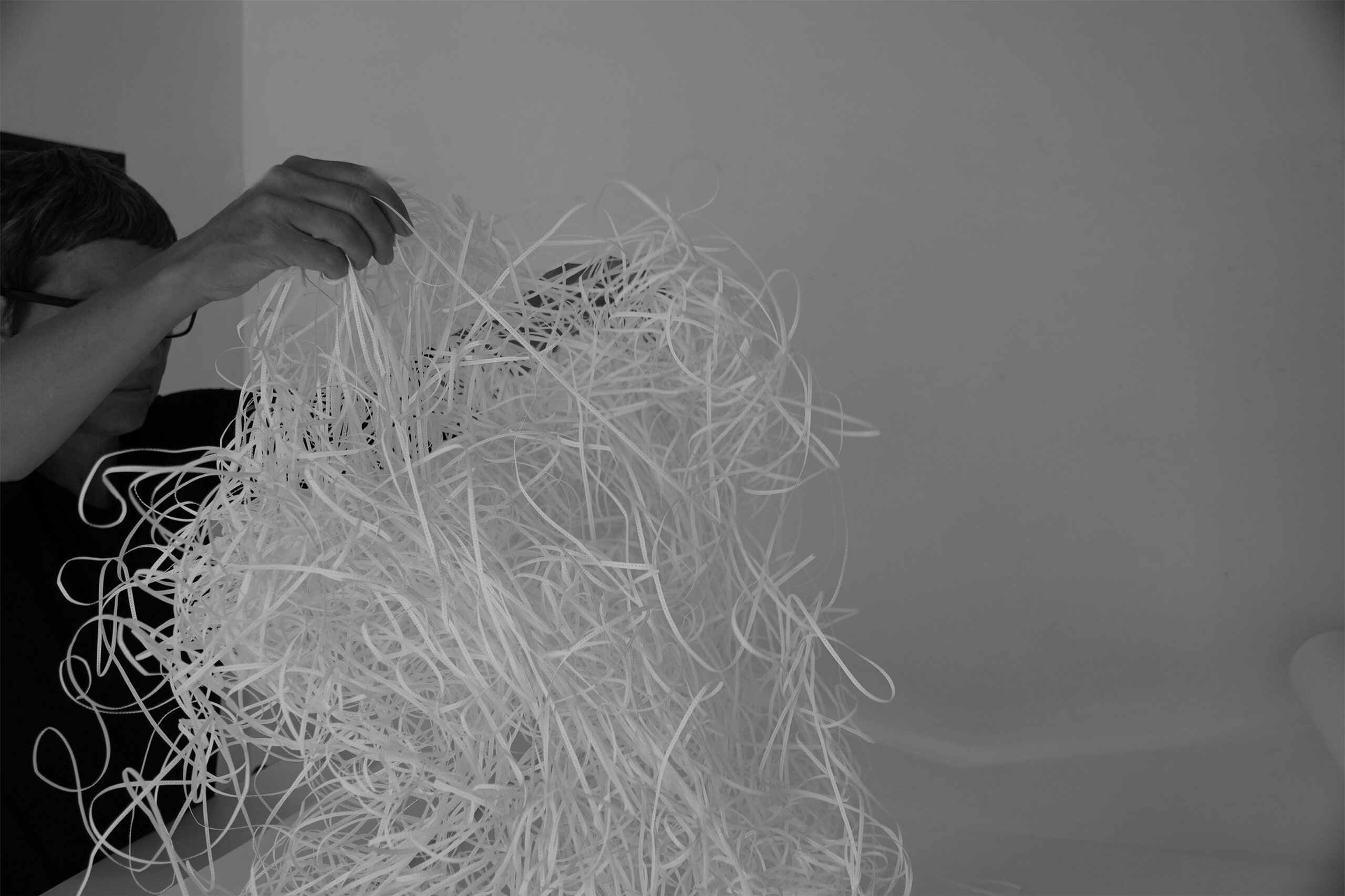Hundreds of thousands of pinpricks and hundreds of meters of tangled paper strips will accumulate over time to resemble a large amorphous cloud-like form.